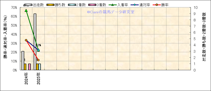 | 2025/6/7 | 阪神 | 9 | 芝 | 1800 | 500万 | 城崎特別 | 10 | 1 | 7 | 7 | 松若 風馬 | 55 | 1分46秒9 | 0.4 | 35.9 | 34.3 | 最内 (5) | 7 | 曇 | 良 | 474 | 15.9 | 0 | 0 | ||