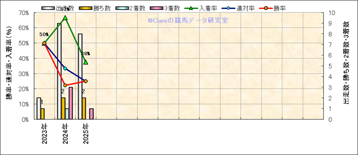 | 2025/7/19 | 函館 | 11 | ダート | 1700 | オープン | マリーンステーク | 14 | 3 | 3 | 1 | 吉田 豊 | 56 | 1分43秒8 | 0.3 | 36.2 | 36.8 | 最内 (6) | 2 | 晴 | 良 | 514 | 5.8 | 580 | 250 | ||