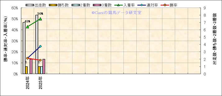 | 2025/4/13 | 中山 | 10 | 芝 | 2000 | 1000万 | 鹿野山特別 | 10 | 9 | 2 | 5 | A.シュタルケ | 58 | 2分02秒3 | 0.5 | 38.9 | 34.6 | 外 (2) | 8 | 雨 | 良 | 444 | 4.2 | 0 | 0 | ||