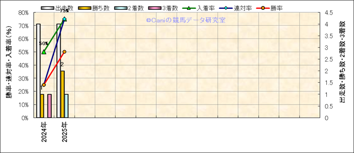 | 2024/10/13 | 京都 | 1 | ダート | 1400 | 未勝利 | 11 | 2 | 2 | 3 | 横山 武史 | 56 | 1分26秒0 | 0.5 | 35.7 | 37.8 | 最内 (1) | 10 | 晴 | 良 | 490 | 3.1 | 0 | 130 | |||