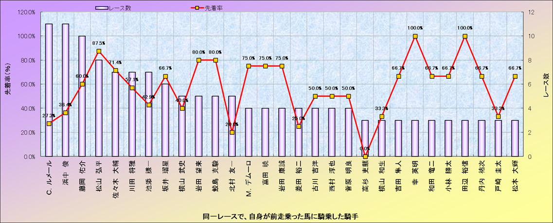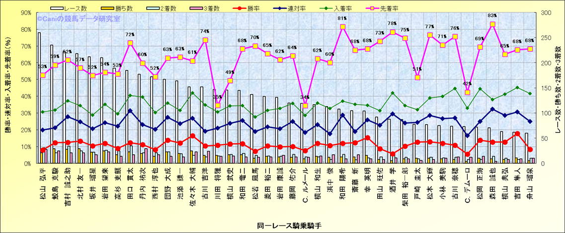 ライバル(相性)解析。 同一レースに下記騎手が騎乗した場合の成績と、その騎手に先着する先着率(近1年) |