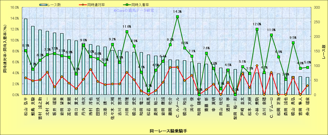 ライバル(相性)解析。 同一レースに下記騎手が騎乗した場合の同時に連対する率と同時に入着する率(近1年) |