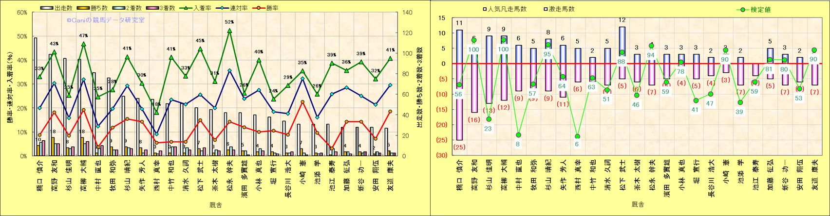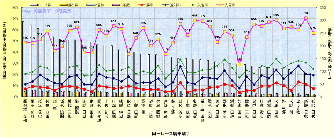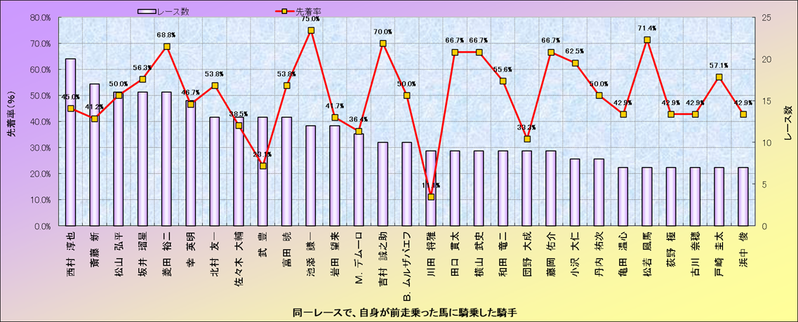 ライバル(相性)解析。 同一レースに下記騎手が騎乗した場合の成績と、その騎手に先着する先着率(近1年) |
