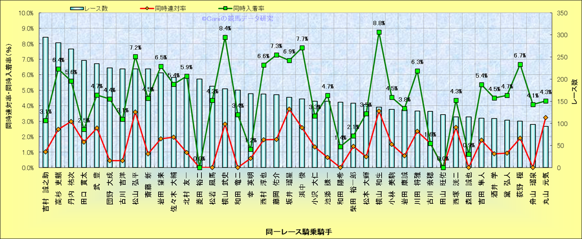 ライバル(相性)解析。 同一レースに下記騎手が騎乗した場合の同時に連対する率と同時に入着する率(近1年) |