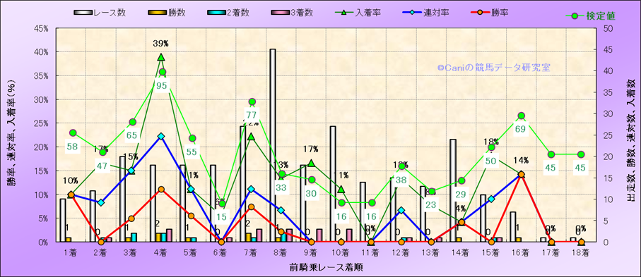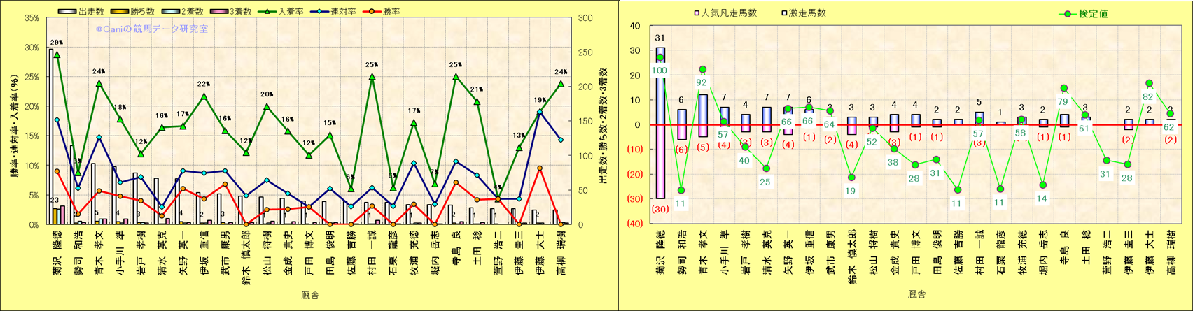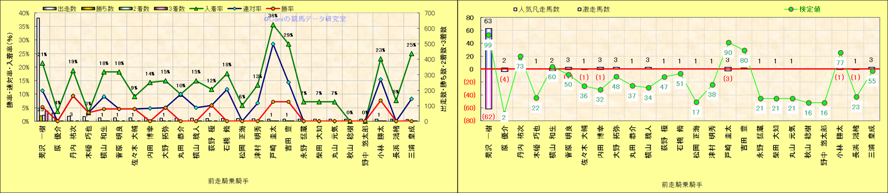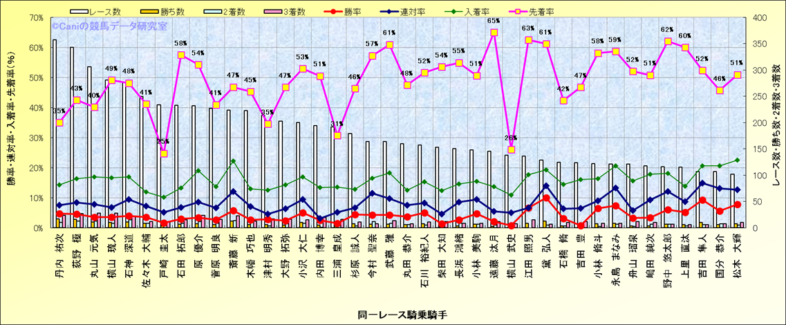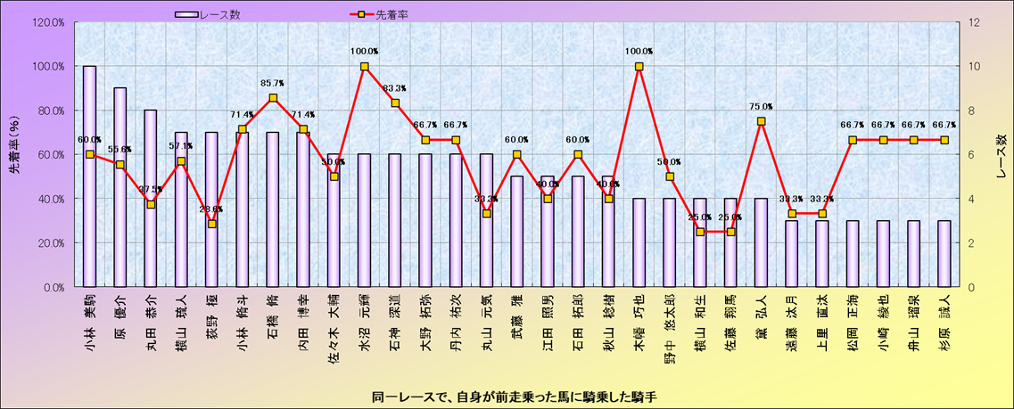 ライバル(相性)解析。 同一レースに下記騎手が騎乗した場合の成績と、その騎手に先着する先着率(近1年) |