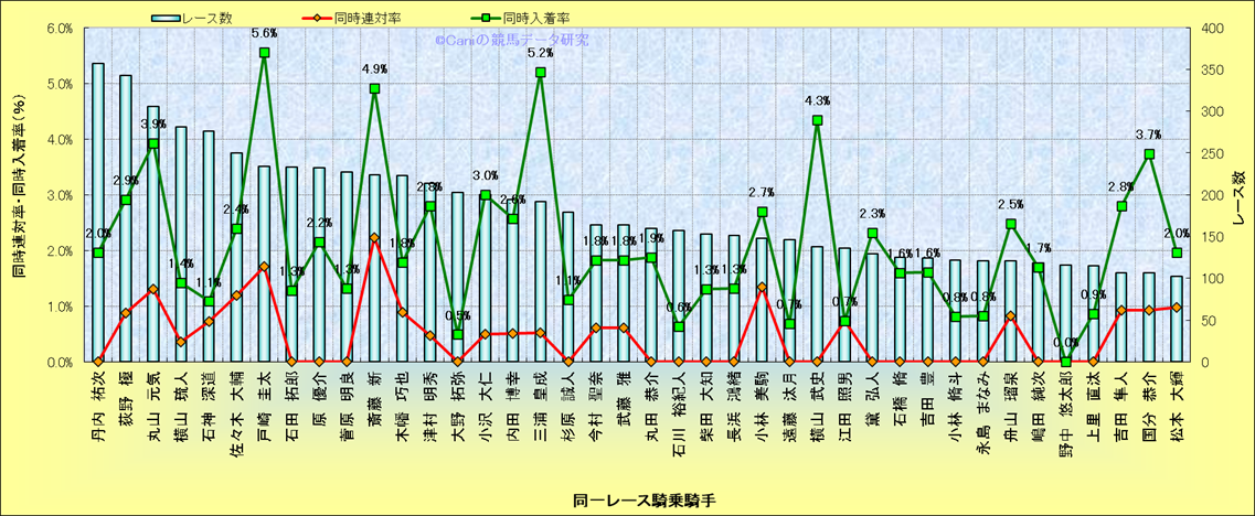 ライバル(相性)解析。 同一レースに下記騎手が騎乗した場合の同時に連対する率と同時に入着する率(近1年) |