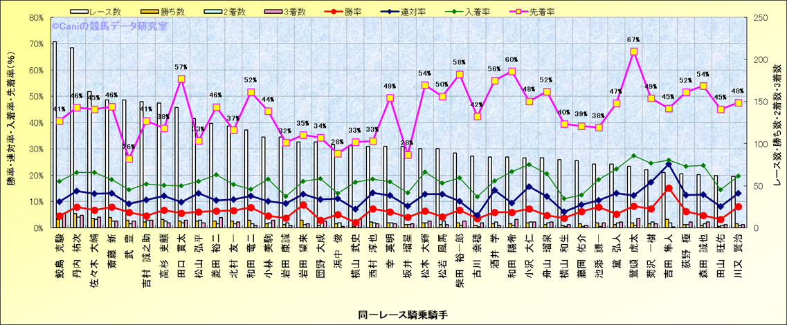 ライバル(相性)解析。 同一レースに下記騎手が騎乗した場合の成績と、その騎手に先着する先着率(近1年) |