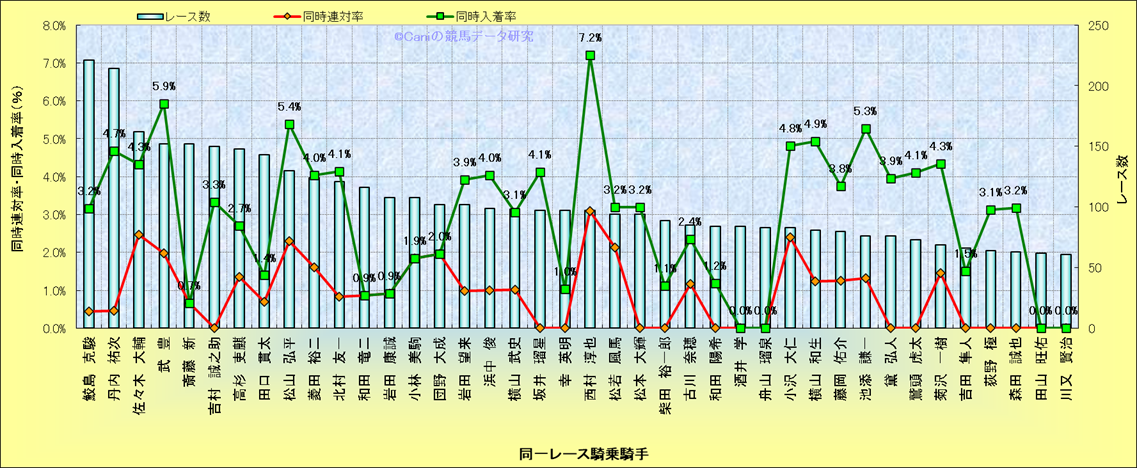 ライバル(相性)解析。 同一レースに下記騎手が騎乗した場合の同時に連対する率と同時に入着する率(近1年) |