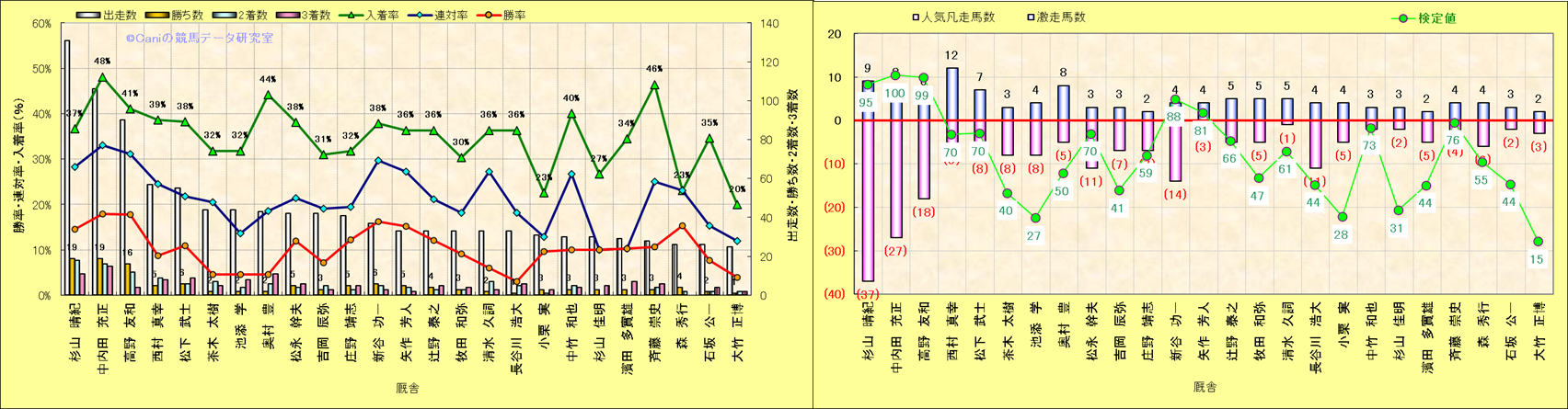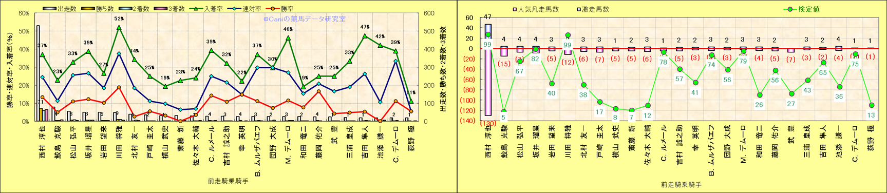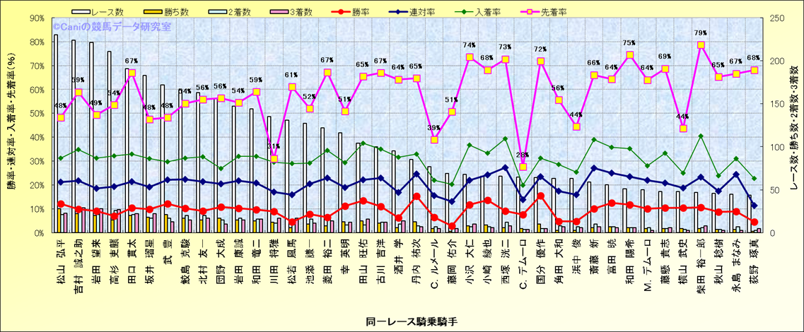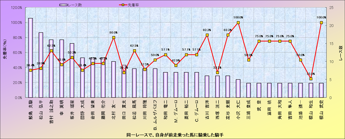 ライバル(相性)解析。 同一レースに下記騎手が騎乗した場合の成績と、その騎手に先着する先着率(近1年) |