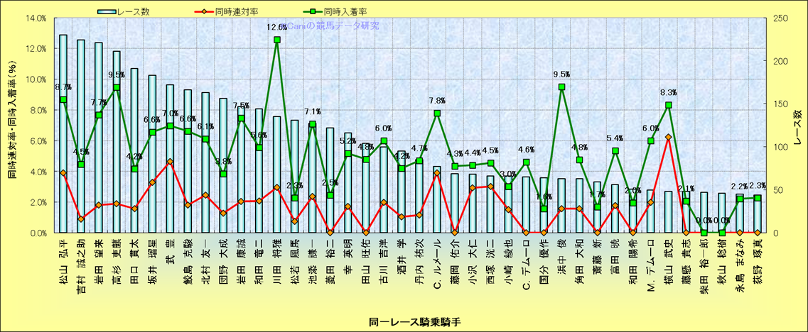 ライバル(相性)解析。 同一レースに下記騎手が騎乗した場合の同時に連対する率と同時に入着する率(近1年) |