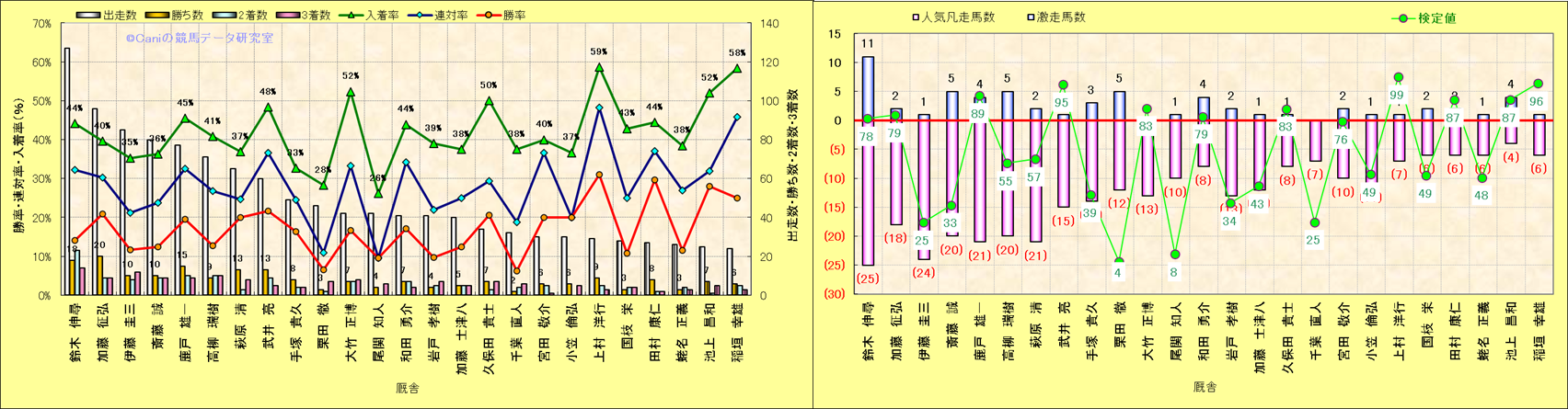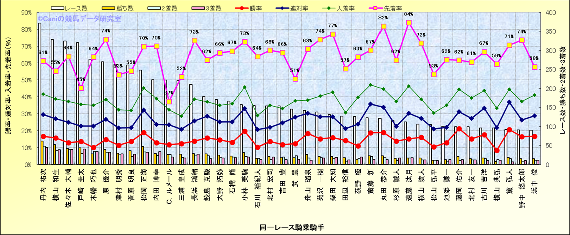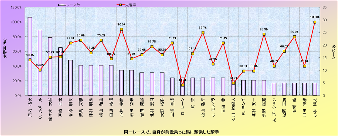 ライバル(相性)解析。 同一レースに下記騎手が騎乗した場合の成績と、その騎手に先着する先着率(近1年) |