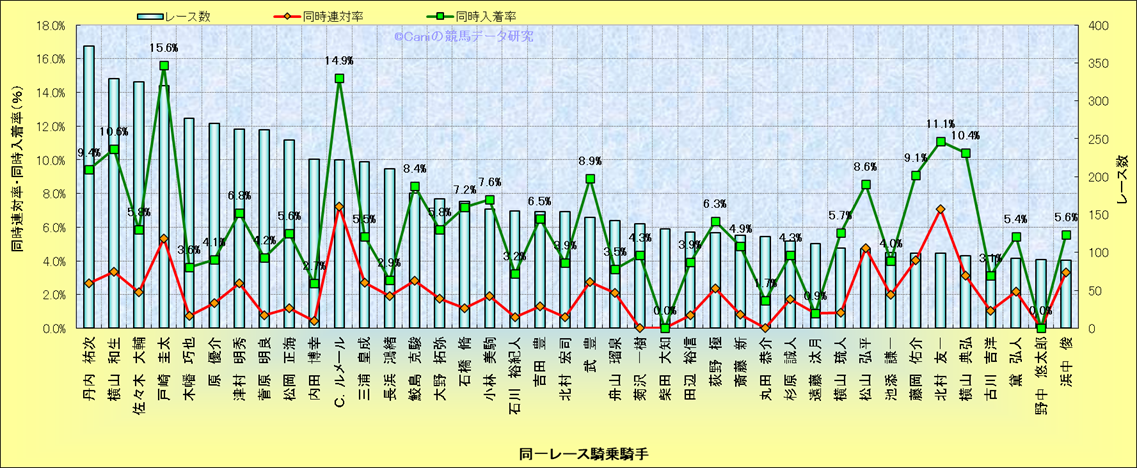 ライバル(相性)解析。 同一レースに下記騎手が騎乗した場合の同時に連対する率と同時に入着する率(近1年) |