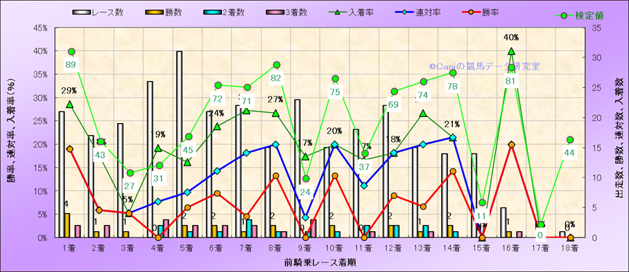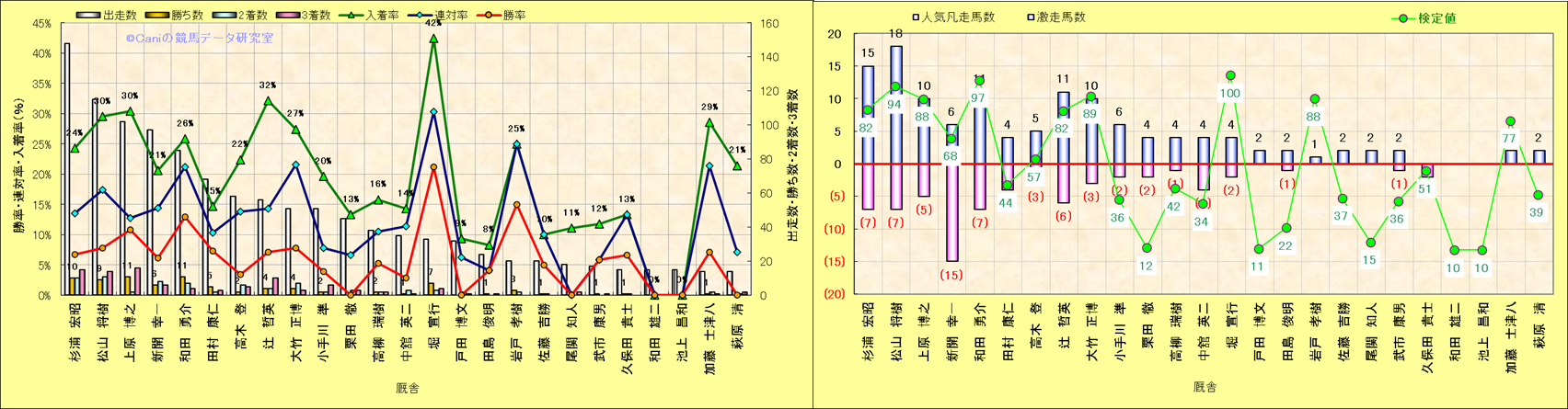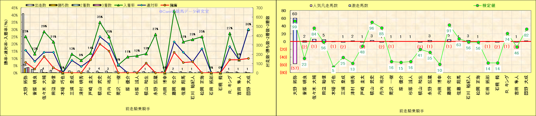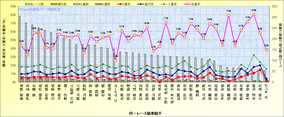 ライバル(相性)解析。 同一レースに下記騎手が騎乗した場合の成績と、その騎手に先着する先着率(近1年) |
