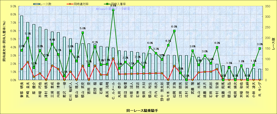 ライバル(相性)解析。 同一レースに下記騎手が騎乗した場合の同時に連対する率と同時に入着する率(近1年) |