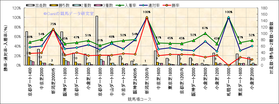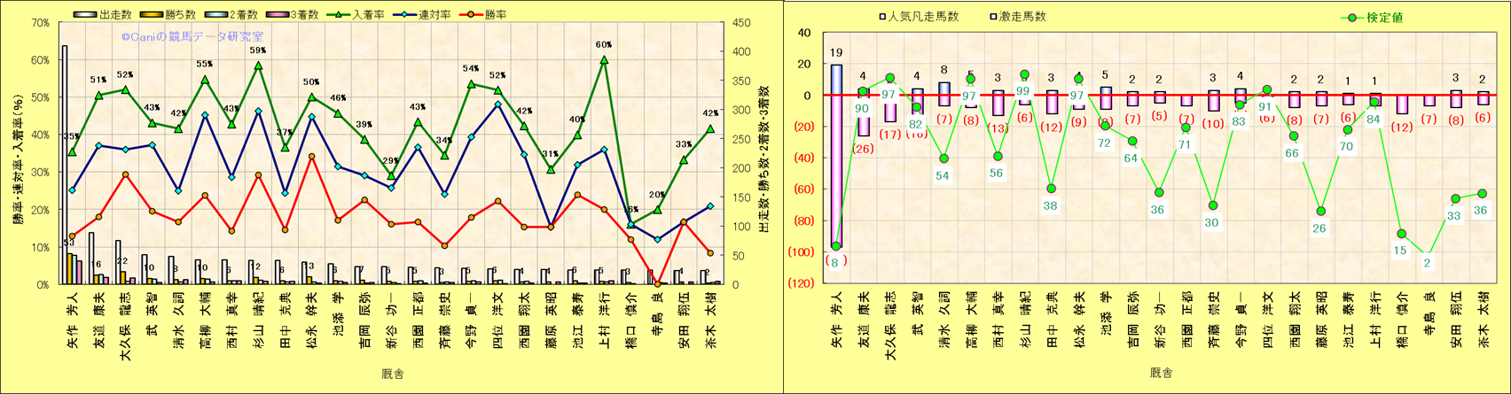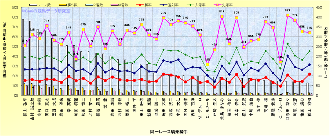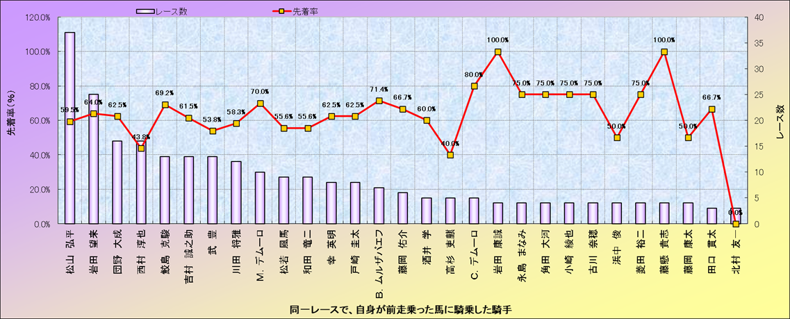 ライバル(相性)解析。 同一レースに下記騎手が騎乗した場合の成績と、その騎手に先着する先着率(近1年) |