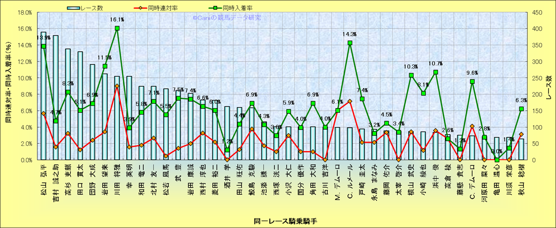 ライバル(相性)解析。 同一レースに下記騎手が騎乗した場合の同時に連対する率と同時に入着する率(近1年) |