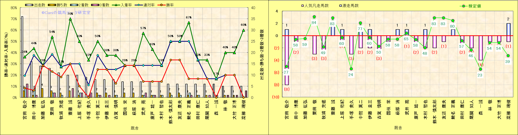 ライバル(相性)解析。 同一レースに下記騎手が騎乗した場合の同時に連対する率と同時に入着する率(近1年) |