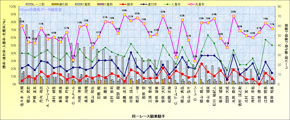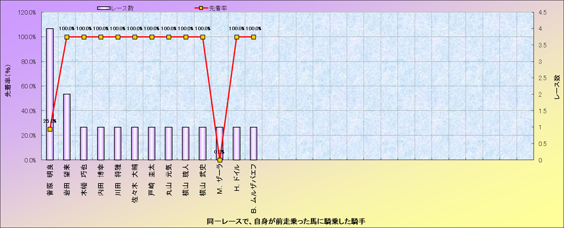 ライバル(相性)解析。 同一レースに下記騎手が騎乗した場合の成績と、その騎手に先着する先着率(近1年) |