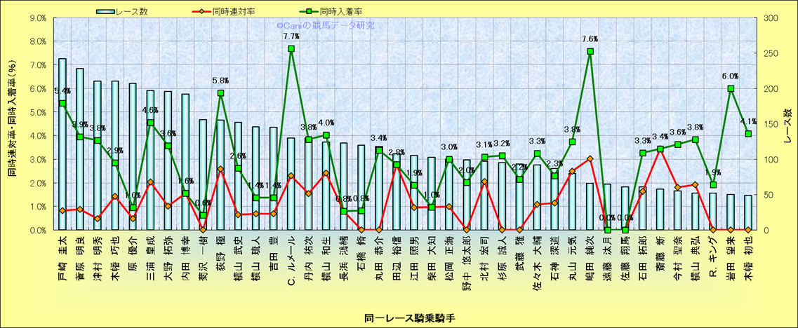 ライバル(相性)解析。 同一レースに下記騎手が騎乗した場合の同時に連対する率と同時に入着する率(近1年) |
