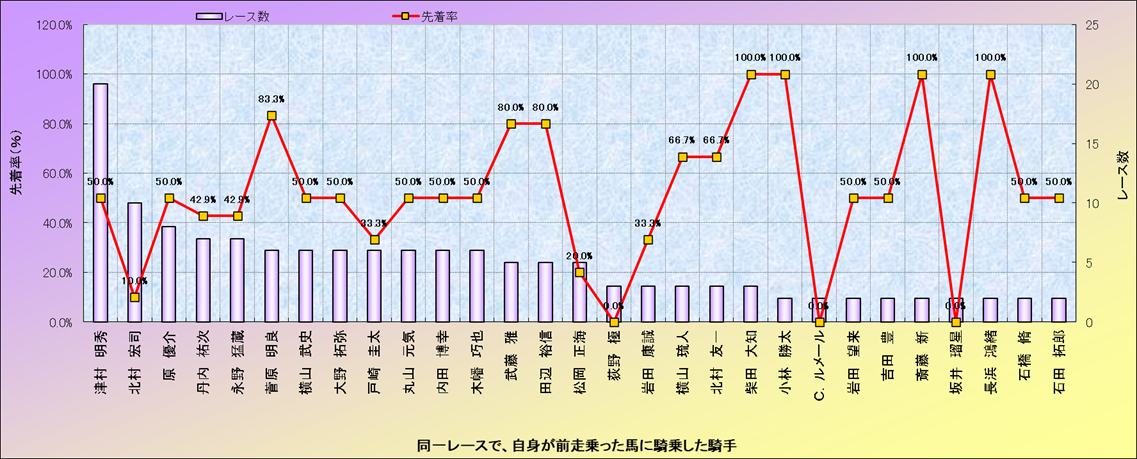 ライバル(相性)解析。 同一レースに下記騎手が騎乗した場合の成績と、その騎手に先着する先着率(近1年) |