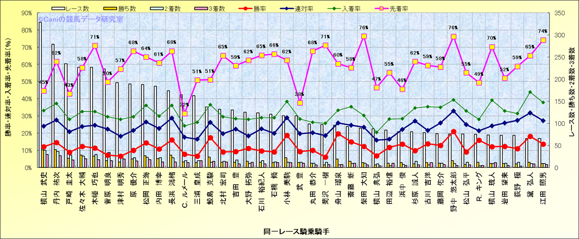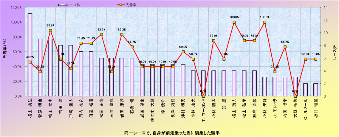 ライバル(相性)解析。 同一レースに下記騎手が騎乗した場合の成績と、その騎手に先着する先着率(近1年) |