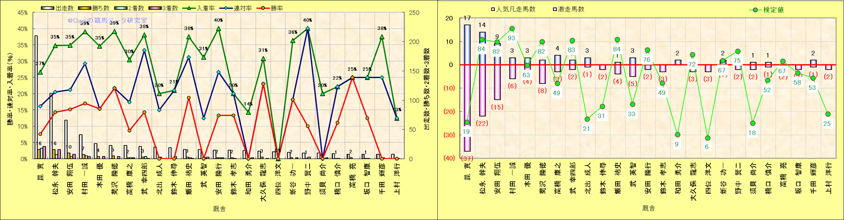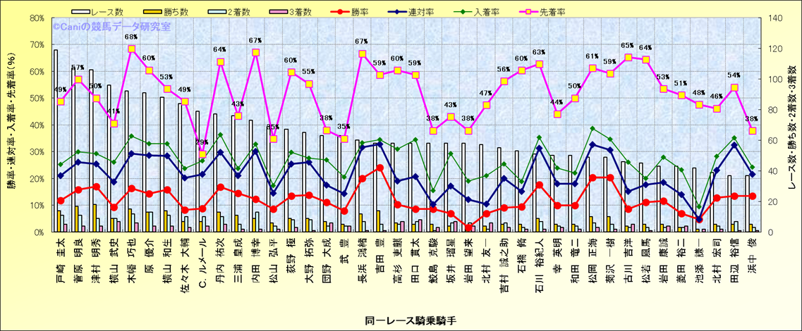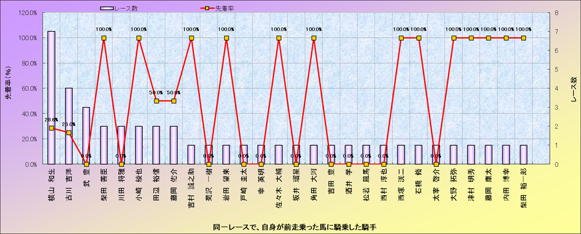 ライバル(相性)解析。 同一レースに下記騎手が騎乗した場合の成績と、その騎手に先着する先着率(近1年) |