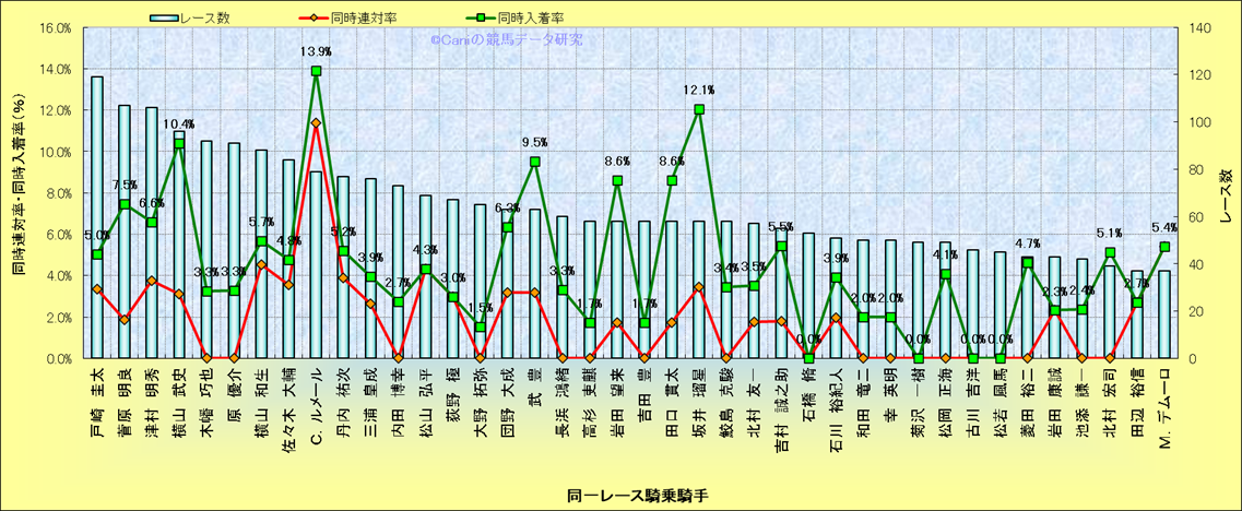 ライバル(相性)解析。 同一レースに下記騎手が騎乗した場合の同時に連対する率と同時に入着する率(近1年) |