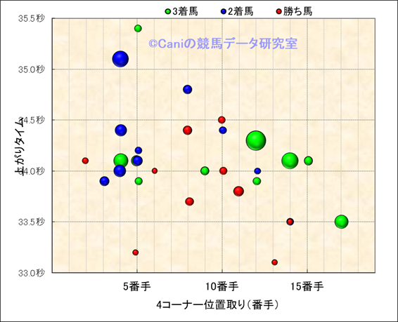 4コーナー順位-上がりタイム散布図(良馬場限定) |