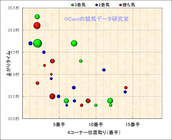 4コーナー順位-上がりタイム散布図(良馬場限定) |