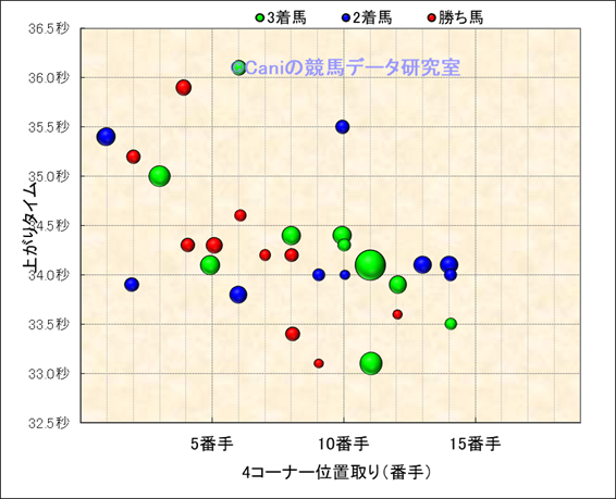4コーナー順位-上がりタイム散布図(良馬場限定) |