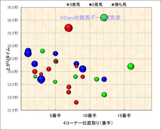 4コーナー順位-上がりタイム散布図(良馬場限定) |
