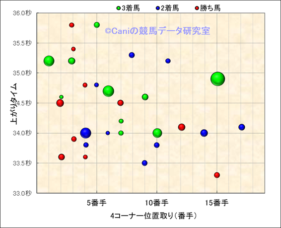 4コーナー順位-上がりタイム散布図(良馬場限定) |