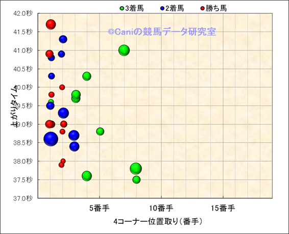 4コーナー順位-上がりタイム散布図(良馬場限定) |