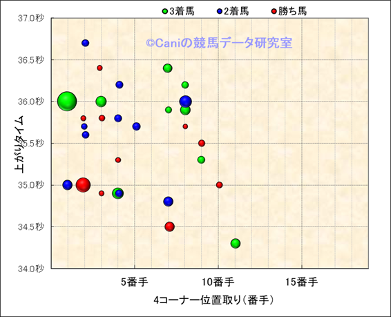 4コーナー順位-上がりタイム散布図(良馬場限定) |
