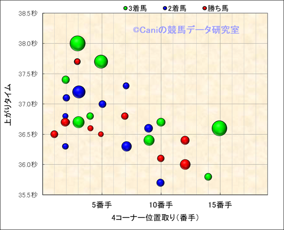 4コーナー順位-上がりタイム散布図(良馬場限定) |