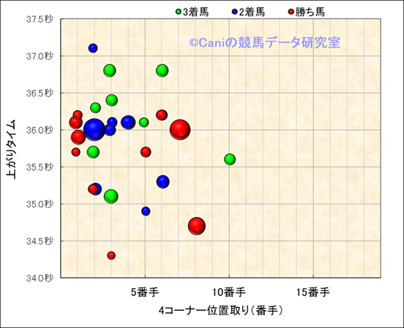 4コーナー順位-上がりタイム散布図(良馬場限定) |