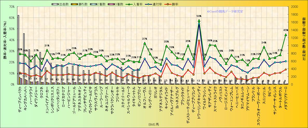 | 馬名 | 父名 | BMS名 | 勝利数 | 2着数 | 3着数 | 勝率 | 連対率 | 入着率 | ||||||