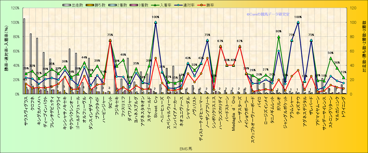 | 馬名 | 父名 | BMS名 | 勝利数 | 2着数 | 3着数 | 勝率 | 連対率 | 入着率 | ||||||
