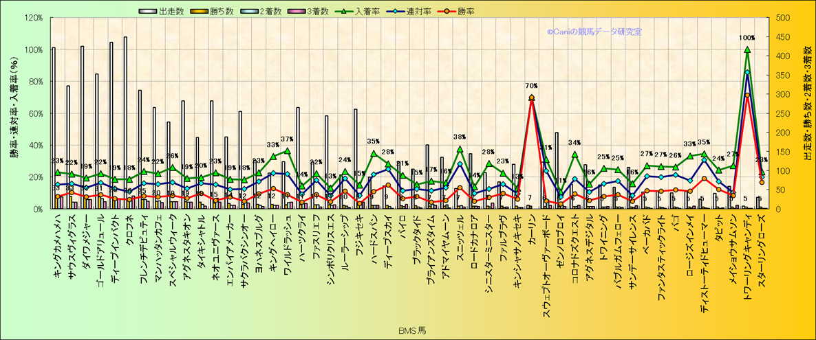 | 馬名 | 父名 | BMS名 | 勝利数 | 2着数 | 3着数 | 勝率 | 連対率 | 入着率 | ||||||