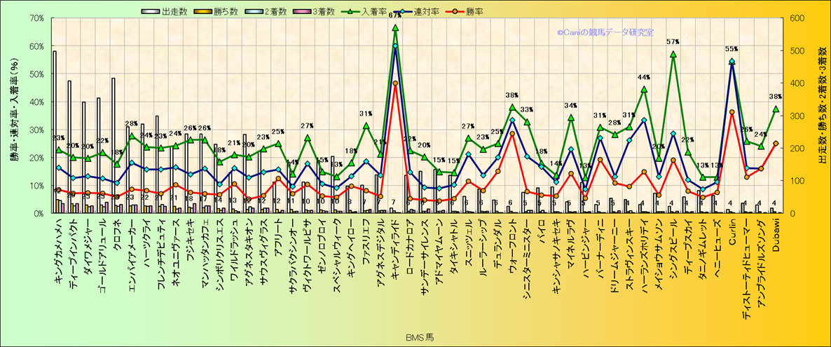 | 馬名 | 父名 | BMS名 | 勝利数 | 2着数 | 3着数 | 勝率 | 連対率 | 入着率 | ||||||