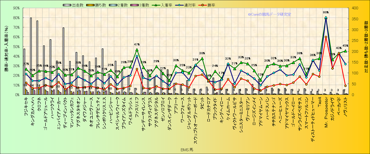 | 馬名 | 父名 | BMS名 | 勝利数 | 2着数 | 3着数 | 勝率 | 連対率 | 入着率 | ||||||