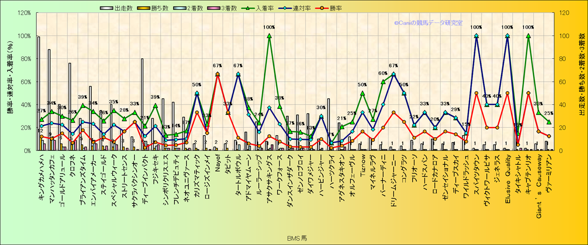 | 馬名 | 父名 | BMS名 | 勝利数 | 2着数 | 3着数 | 勝率 | 連対率 | 入着率 | ||||||
